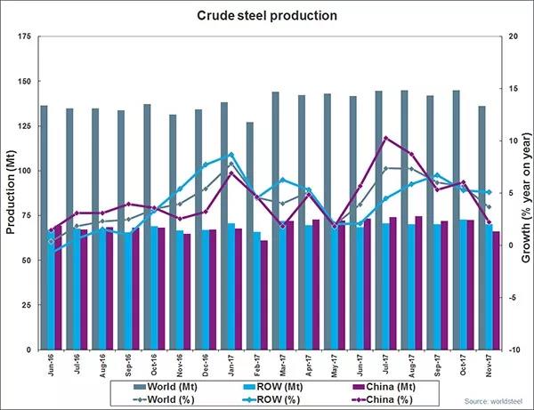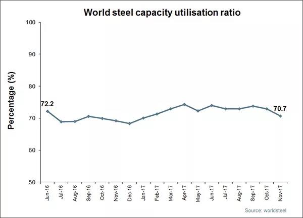 2017年11月全球66個(gè)納入世界鋼鐵協(xié)會(huì)統(tǒng)計(jì)國(guó)家的粗鋼產(chǎn)量為1.363億噸,同比提高3.7%;粗鋼產(chǎn)能利用率為70.7%,同比提高1.5個(gè)百分點(diǎn),環(huán)比下降2.2個(gè)百分點(diǎn)。