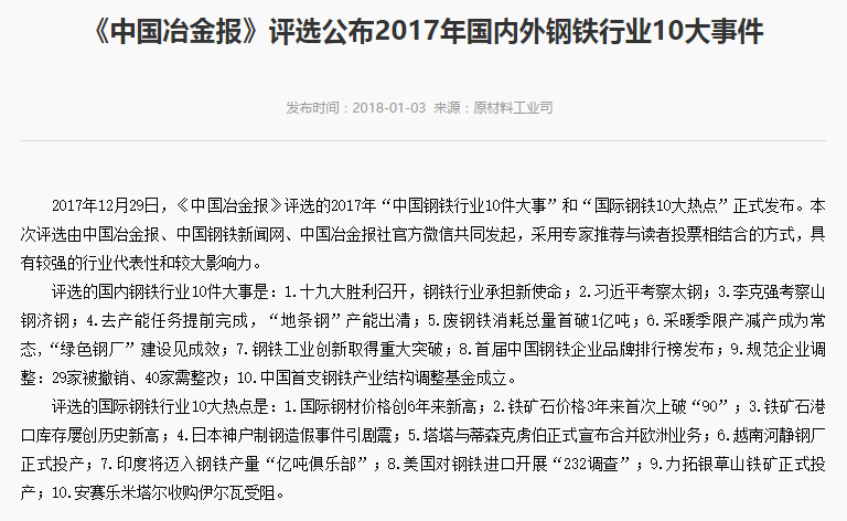 2018年1月3日,工業(yè)和信息化部在官網(wǎng)上刊出《<中國冶金報>評選公布2017年國內(nèi)外鋼鐵行業(yè)10大事件》一文,對《中國冶金報》評選的2017年“中國鋼鐵行業(yè)10件大事”和“國際鋼鐵10大熱點”進行了介紹。